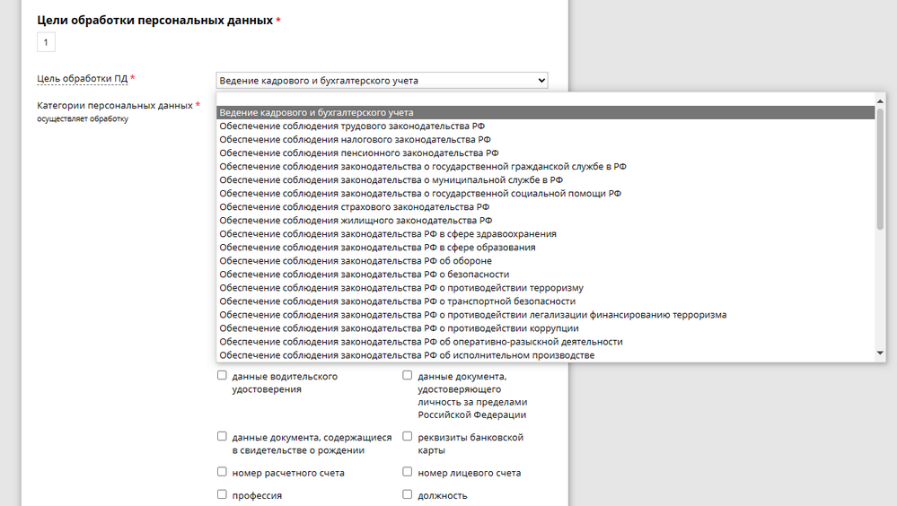 В разделе «Цель обработки персональных данных» прежде всего из выпадающего списка выбирается цель. Она должна описывать действия оператора, для осуществления которых он обрабатывает ПД.