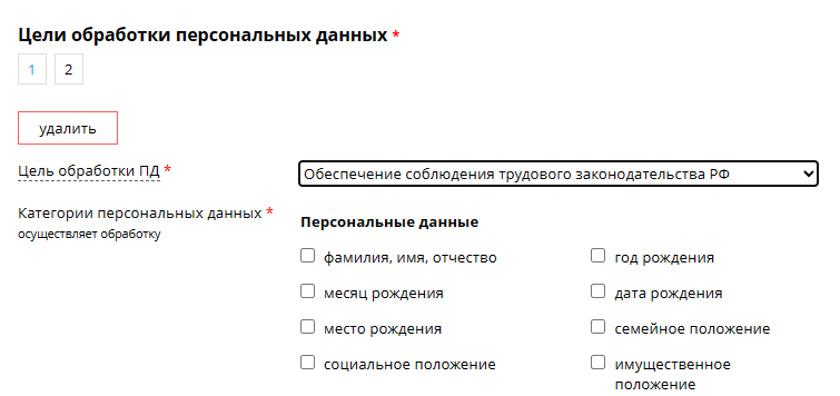Компании, как минимум, используют личные данные сотрудников для ведения кадрового и бухгалтерского учета, для обеспечения соблюдения трудового законодательства, также они могут использоваться для подготовки, заключения, исполнения ГПХ, для обеспечения пропускного режима. Кроме того, компания может работать с ПД сторонних лиц — представителей контрагентов, клиентов и так далее. Так что целей обработки персональных данных может быть множество. В самом низу раздела, после пункта «Способы обработки», есть кнопка «Добавить цель обработки». При добавлении второй цели под названием раздела «Цели обработки персональных данных» появится вкладка «2». Безопаснее охватить все возможные случаи, когда будет обрабатываться персональная информация.