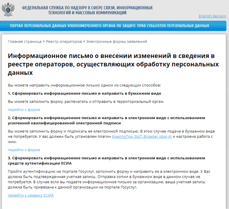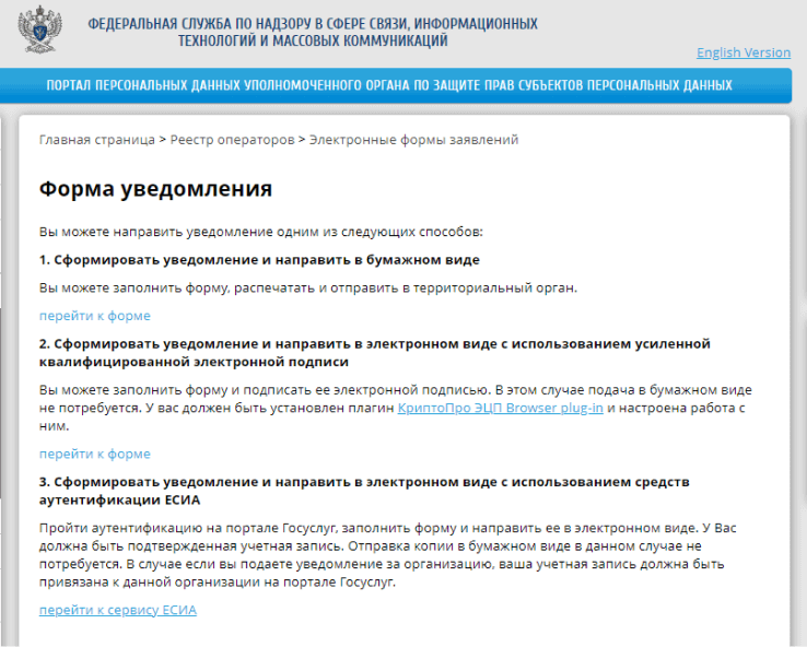 Проще всего заполнить уведомление об обработке персональных данных через сайт Роскомнадзора. Здесь же можно выбрать способ подачи: