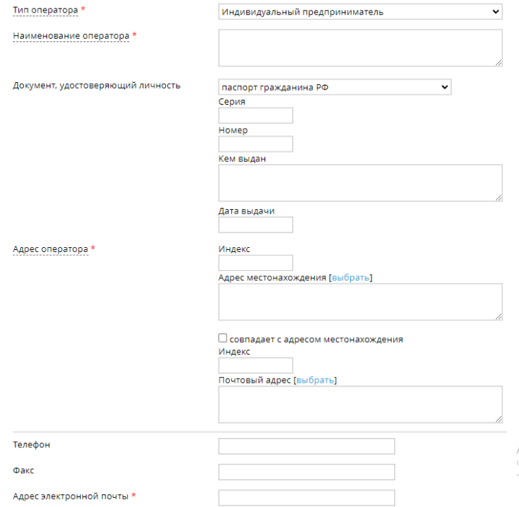 Если в качестве оператора регистрируется индивидуальный предприниматель, то он вписывает паспортные данные, адрес проживания, контакты, коды ИНН и ОГРНИП.