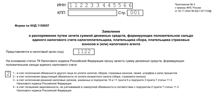 Есть еще один вариант — зачесть деньги с ЕНС согласно ст. 78 НК РФ. Для этого и предназначается заявление о распоряжении путем зачета по форме КНД 1150057. Вот куда можно направить излишек с ЕНС с его помощью: